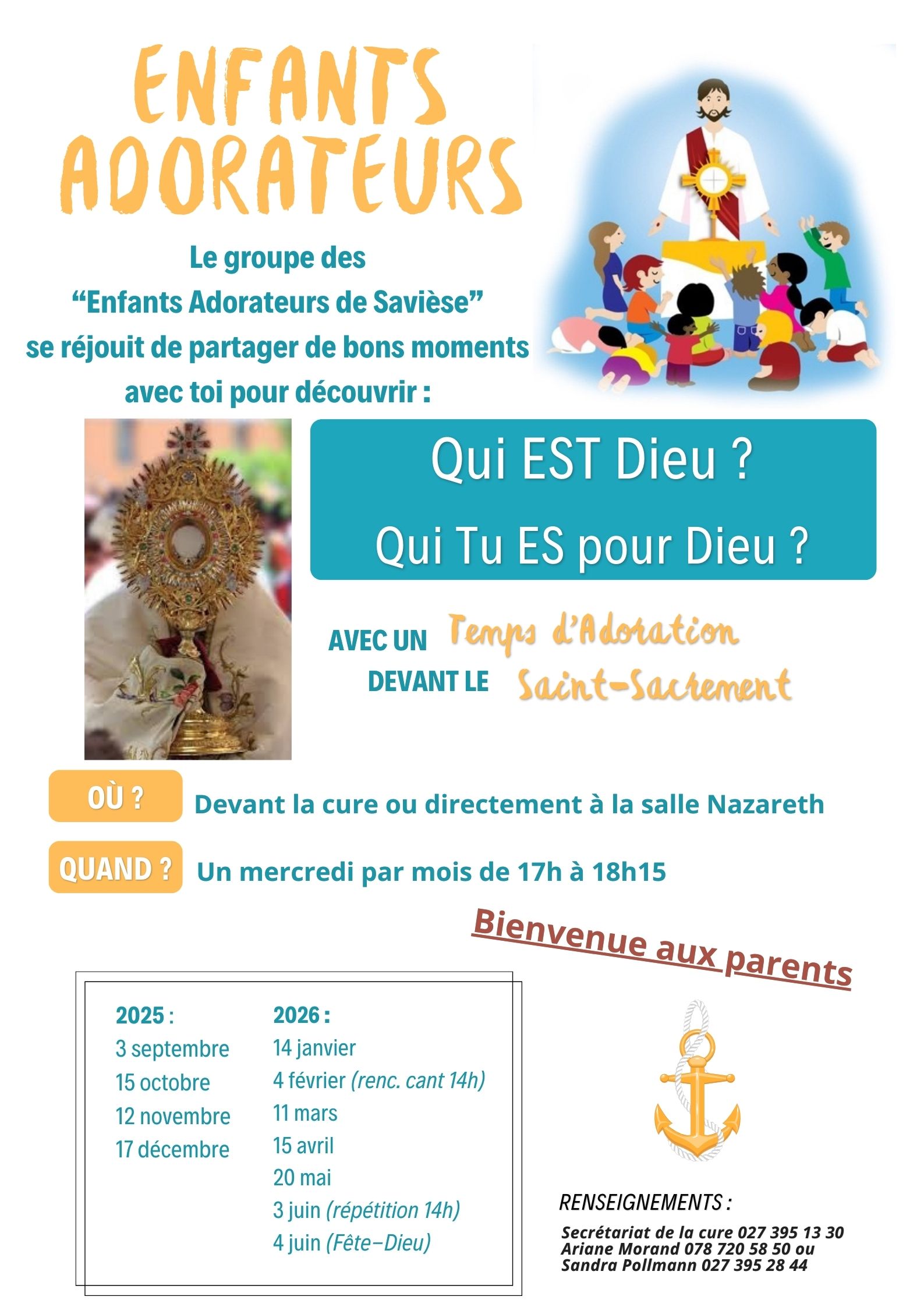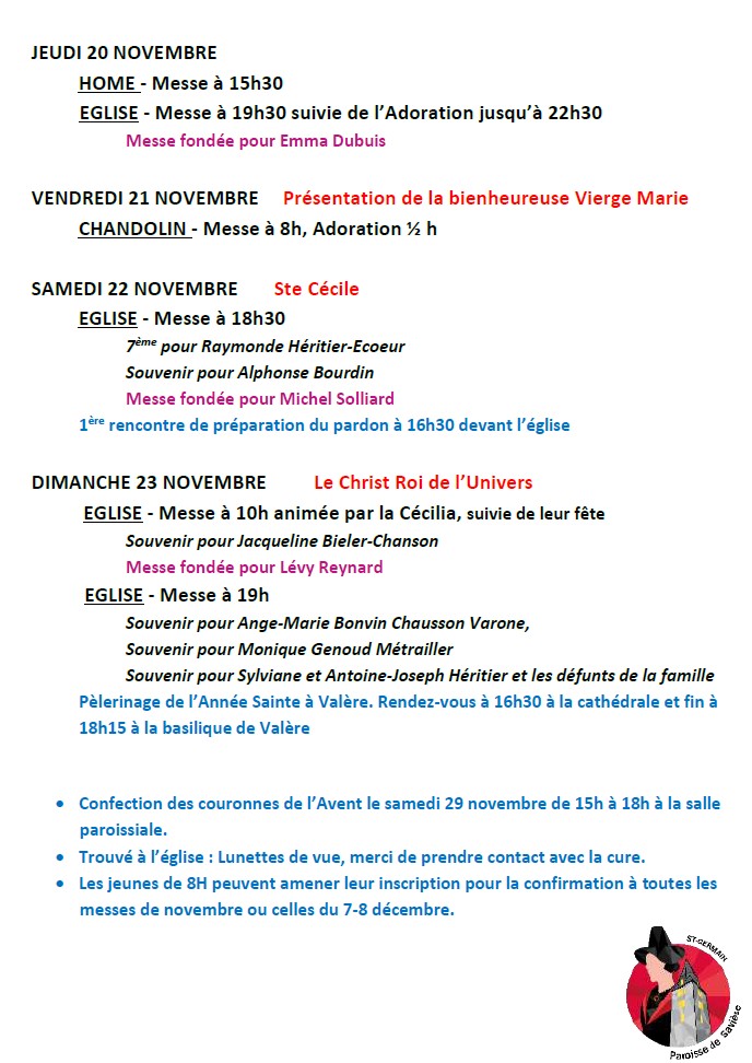 Horaires d’ouverture de l’accueil à la cure : de 8h30 à 11h30, lundi – mardi – jeudi – vendredi (le secrétariat est fermé le mercredi)